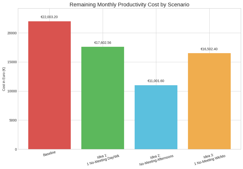 - Total Lost Productivity Cost (Direct Cost of Meetings + Cost of Context Switching): 22,003.20 euro